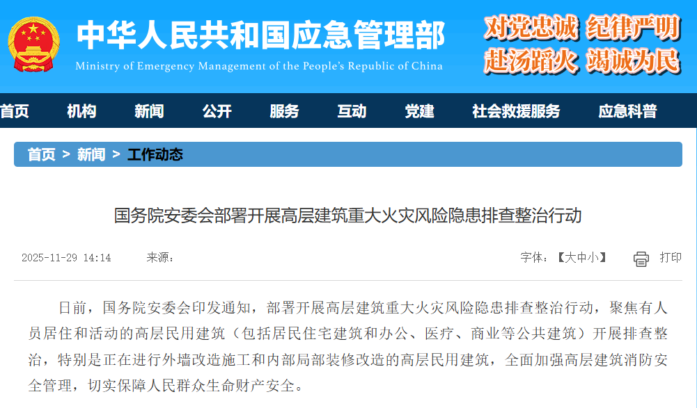 国务院安委会部署:全面排查整治高层建筑重大火灾风险隐患! 为切实加强高层建筑消防安全管理,坚决防范火灾事故发生,近日,国务院安委会印发通知,决定在全国范围内开展高层建筑重大火灾风险隐患排查整治行动。本次行动聚焦于有人员居住和活动的高层民用建筑,涵盖居民住宅以及办公、医疗、商业等公共建筑,特别是针对正在进行外墙改造施工和内部局部装修改造的高层民用建筑,实施重点排查与整治,全力筑牢安全